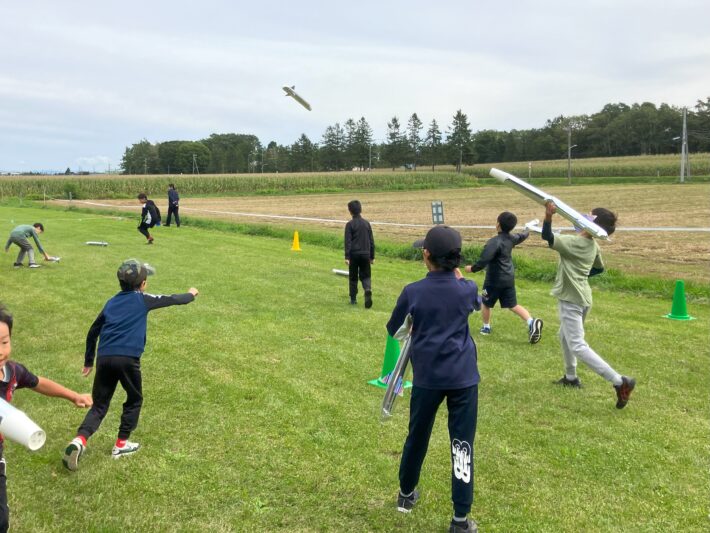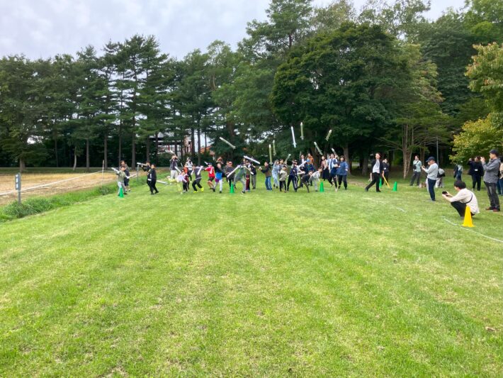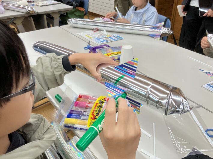 一部で学んだ人工衛星を宇宙に運ぶロケットに親しんでもらおうと、第二部ではバルーンロケットの工作にチャレンジ。製作したバルーンロケットは、会場の外で飛ばしました。子どもたちは、芝生を駆け回りながら夢中で自作のロケットを飛ばしつつ、羽の数を増やしてみたり、重心の位置を調整してみたりと、より遠くへ飛ばすために試行錯誤を繰り返していました。