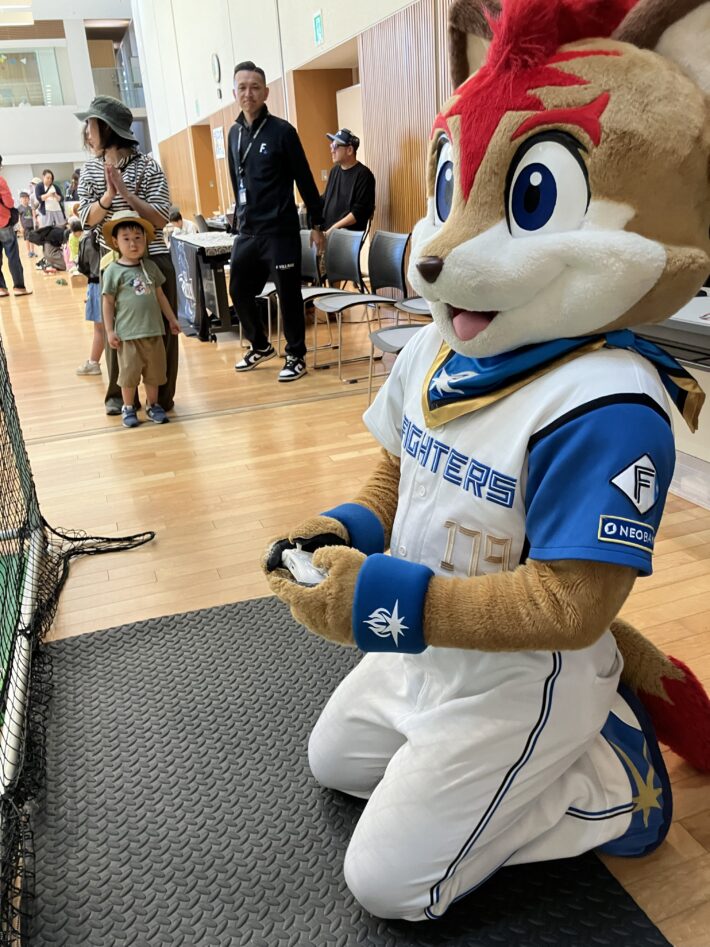 イベントを盛り上げるために駆けつけた日本ハムファイターズの大人気マスコット・フレップも、体験会に参加してくれました。運動神経バツグンのフレップは、ドローン操縦もお手の物!上手に機体をコントロールしてドローンサッカーのゴールを何度も通していました!