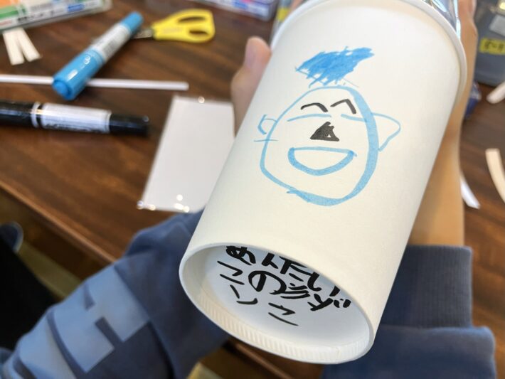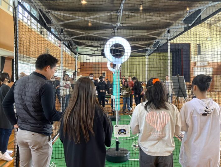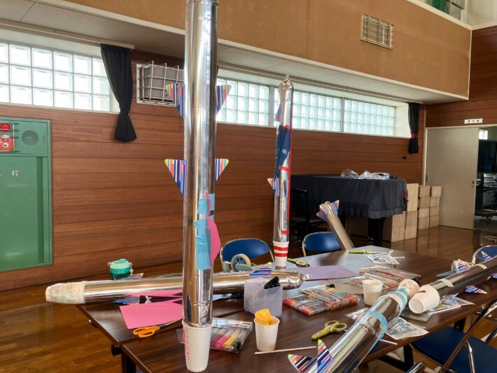 子どもたちを2グループに分け、各グループがドローンサッカー®体験とバルーンロケット工作を交互に行う形式で親子レクがスタート。ドローン操縦を体験する子どもたちは、「楽しい!」とか「難しい!」などと感想を口にしながら機体のコントロールに熱中していました。操縦の感覚をつかんでくると、「私がゴールを守るから、2人は相手のゴールを狙って!」と作戦を立てるチームも現れ、上達の早さに驚かされました。一方のバルーンロケット作りでは、子どもたちが豊かな感性を発揮。ロケットにカラフルな絵を描いたり、愛称をつけたりと、1つとして同じものがない20通りのロケットが誕生しました。体育館を夢中で駆け回りながら、何度も何度もロケットを飛ばしては改良し、少しでも遠くまで飛ばせるように試行錯誤している姿が印象的でした。
