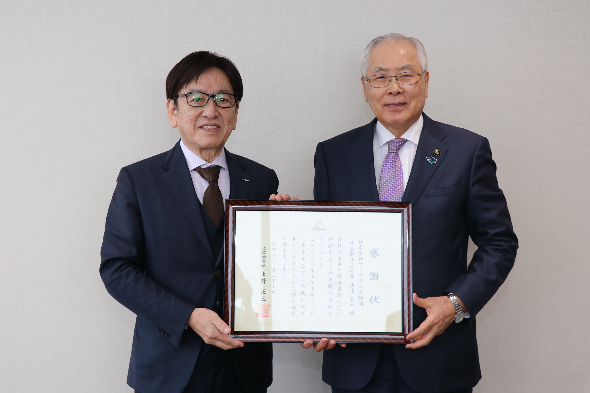 1月29日(木)には、北広島市役所にて、北広島市長の上野正三様より今回の寄付に対する感謝状を拝受しました。企業版ふるさと納税制度を活用した北広島市への寄付は今回で4回目です。