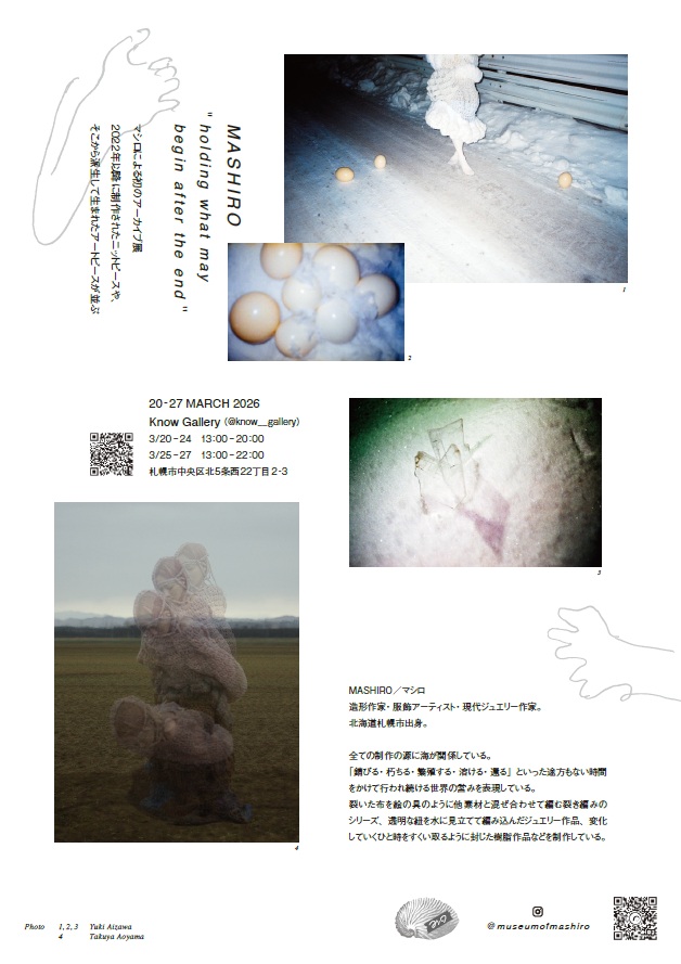 Know Galleryは、作家それぞれの実践を尊重しながら、作品と空間が静かに響き合う展示を重ねてきました。本展においても、MASHIROのまなざしをそのまま受け止め、素材、身体、土が重なり合う場をひらきます。